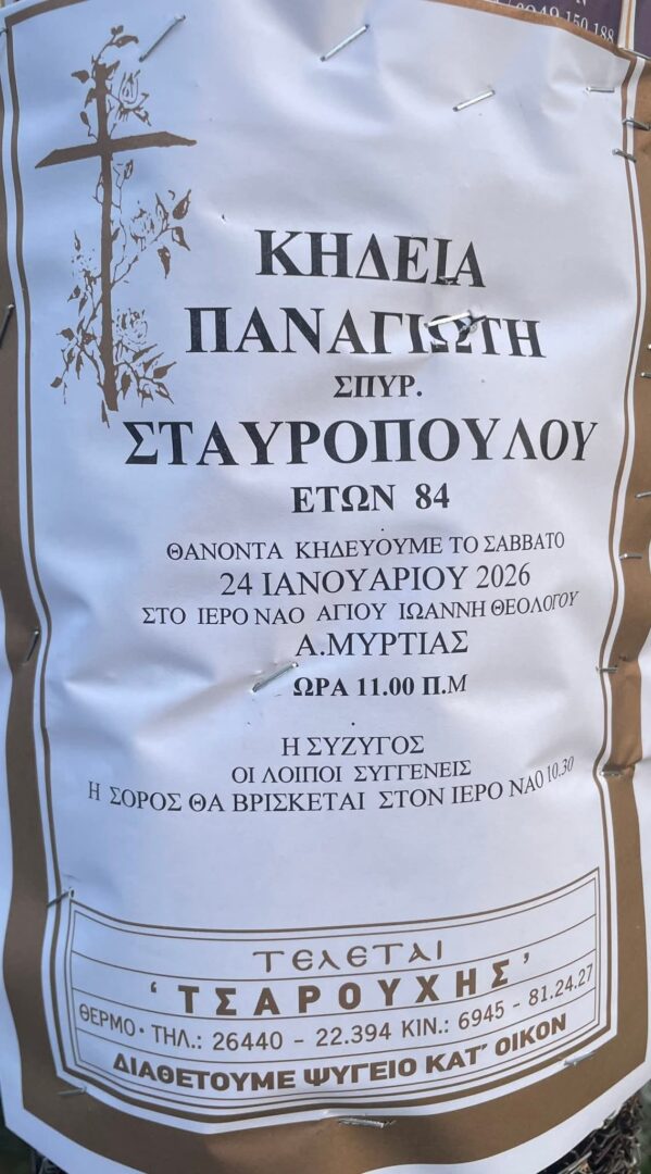 Εκ μέρους του Δ.Σ του Συλλόγου των Μυρτιωτών, ευχόμαστε καλό παράδεισο στον Παναγιώτη Σταυρόπουλο. Θερμά συλλυπητήρια στην οικογένεια του εκλιπόντος.