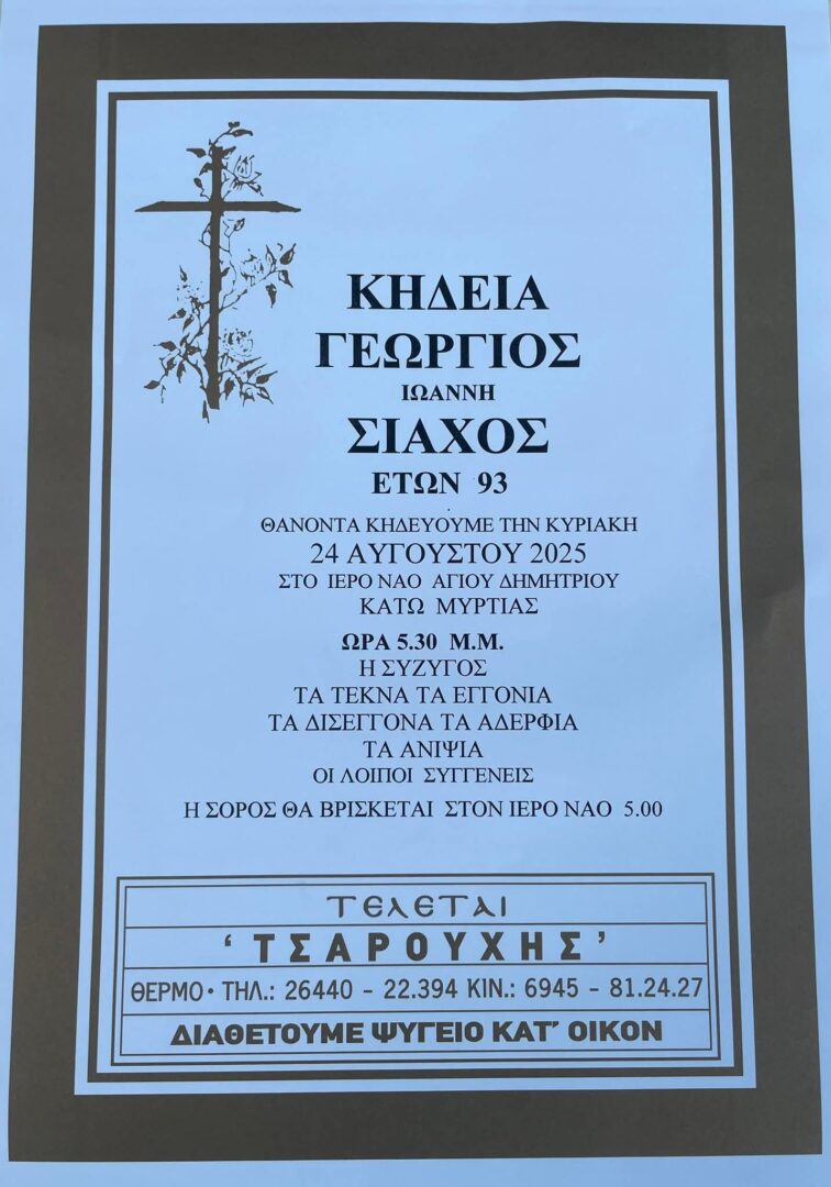 Εκ μέρους του Δ.Σ του Συλλόγου των Μυρτιωτών, ευχόμαστε καλό παράδεισο στον Σιάχο Ι Γεώργιο. Θερμά συλλυπητήρια στην οικογένεια του εκλιπόντος.